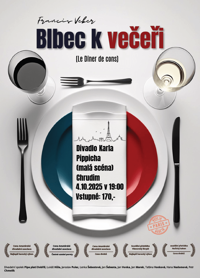 Smích garantován. V sobotu 4. října 2025 v 19:00 přiveze Divadelní spolek Pípa z Dobříše do Divadla Karla Pippicha slavnou francouzskou komedii Blbec k večeři.