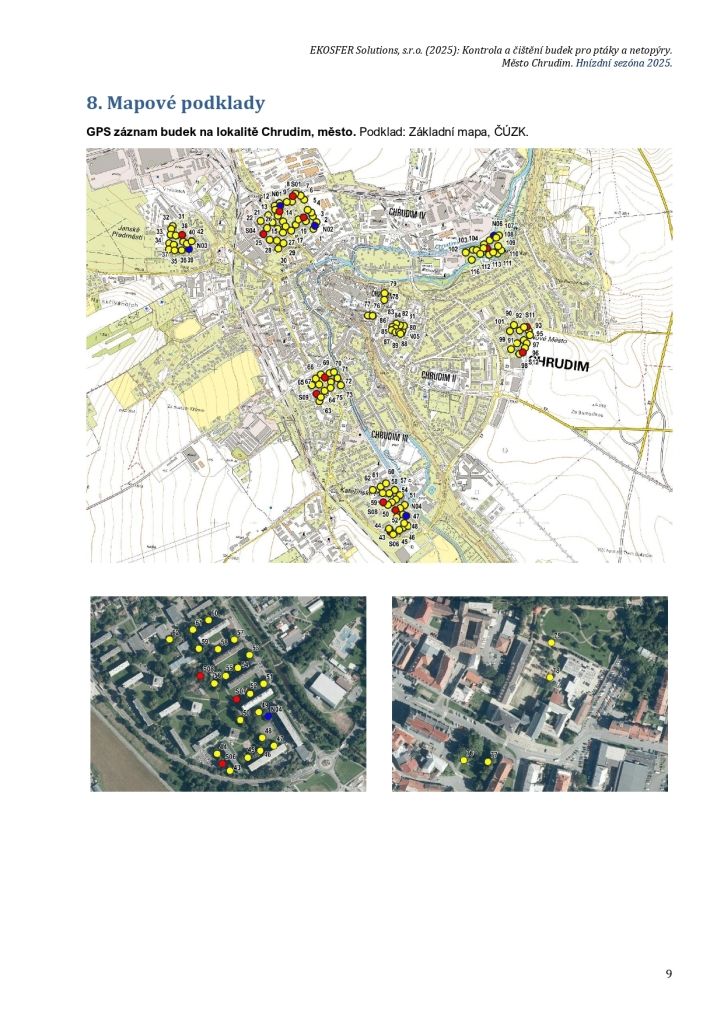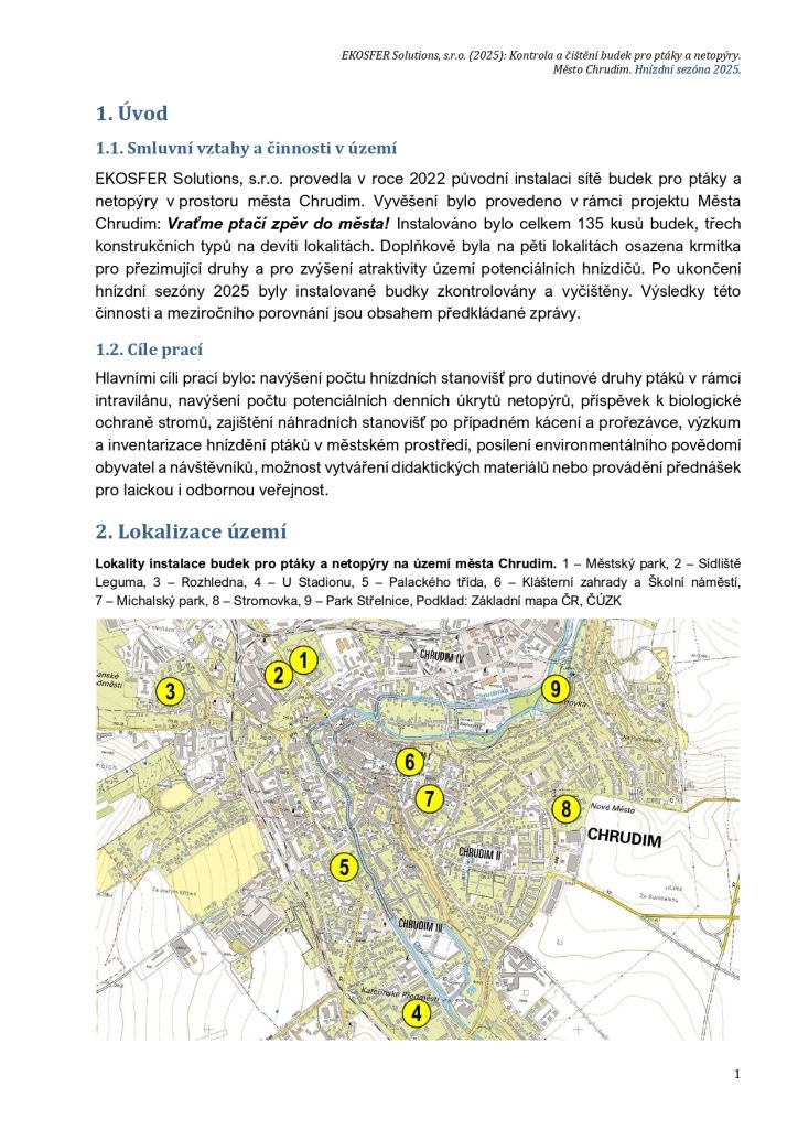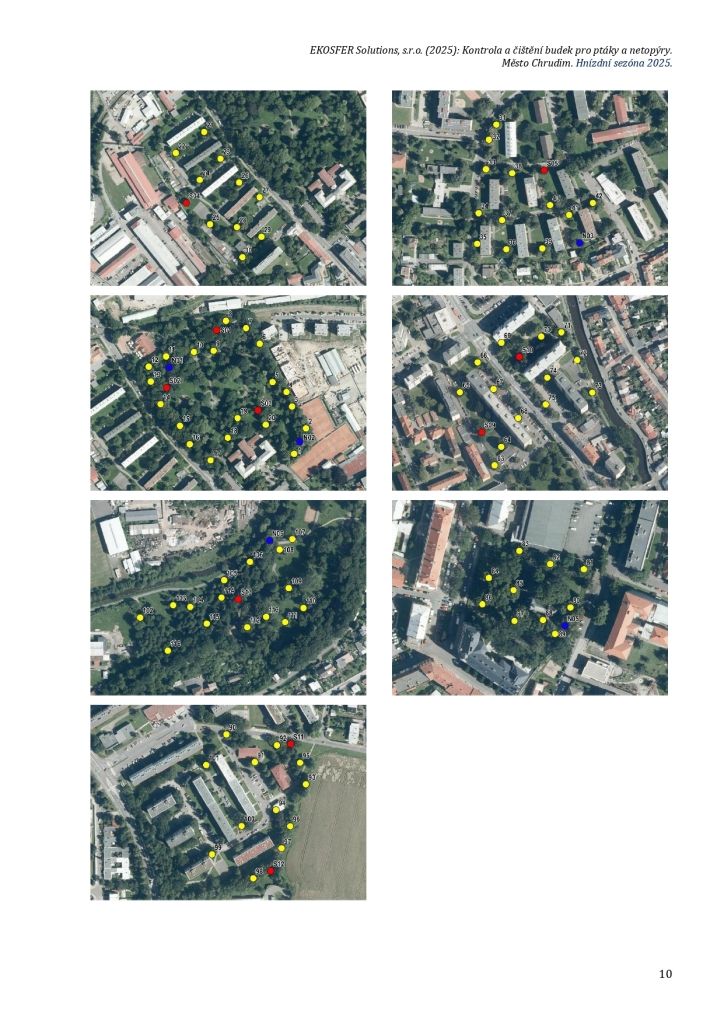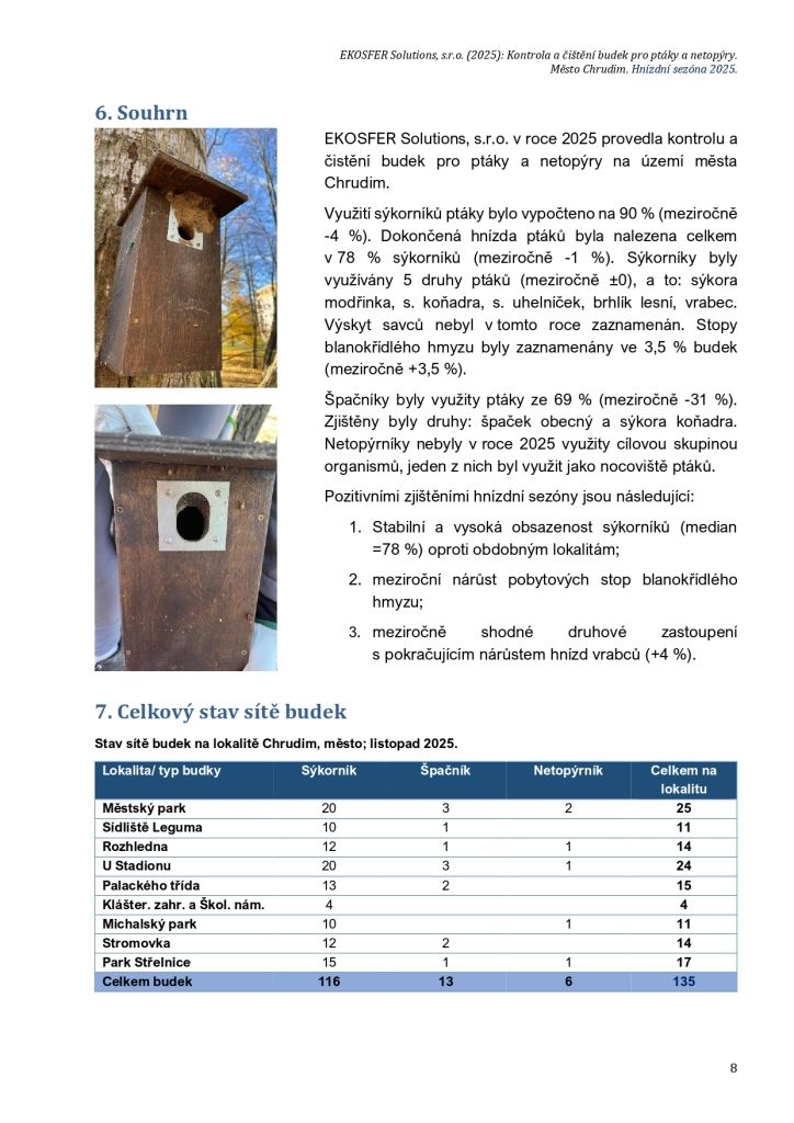 Celkem bylo zkontrolováno 135 budek tří typů. Sýkorníky, špačníky a netopýrníky jsou rozmístěny na devíti místech v Chrudimi. Městský park, Stromovka, Michalský park nebo okolí Palackého třídy tak nejsou jen zelení oázami, ale skutečnými domovy městského ptactva.