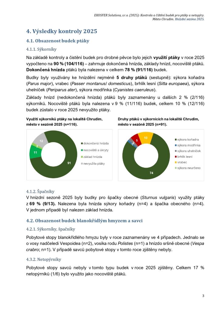 Porovnání let 2022 až 2025 ukazuje, že projekt má dlouhodobý smysl. Stabilní a vysoká obsazenost sýkorníků, která dosahuje 78 %, patří k nejlepším v kraji. Pozitivní je také nárůst hnízd vrabců, kteří se postupně vracejí do městského prostředí.