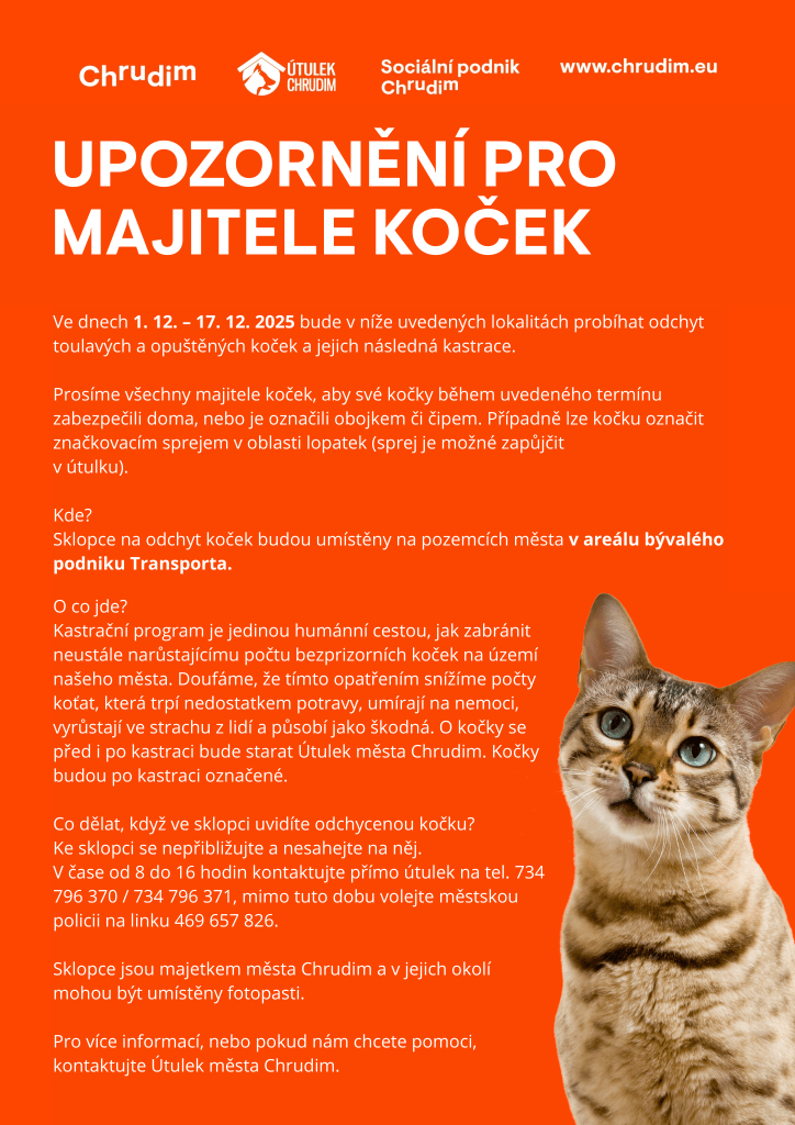 Od 1. 12. do 17. 12. 2025 bude na pozemcích města v areálu bývalého podniku Transporta probíhat odchyt toulavých a opuštěných koček a jejich následná kastrace.