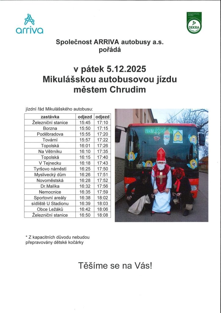 Mikuláš, anděl a čert se opět vydávají do ulic Chrudimi – tentokrát stylově, vlastním Mikulášským autobusem! Ten bude v pátek 5. prosince projíždět městem a rozdávat dobrou náladu, úsměvy a možná i pár čertovských postrašení.